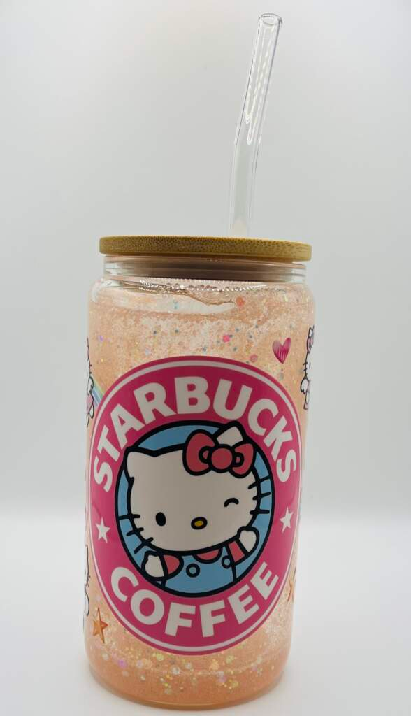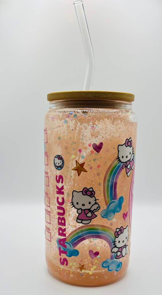 16 oz Double Walled Glittered Glass Beer Can Style Cup with Glass Straw and Bamboo Lip .
