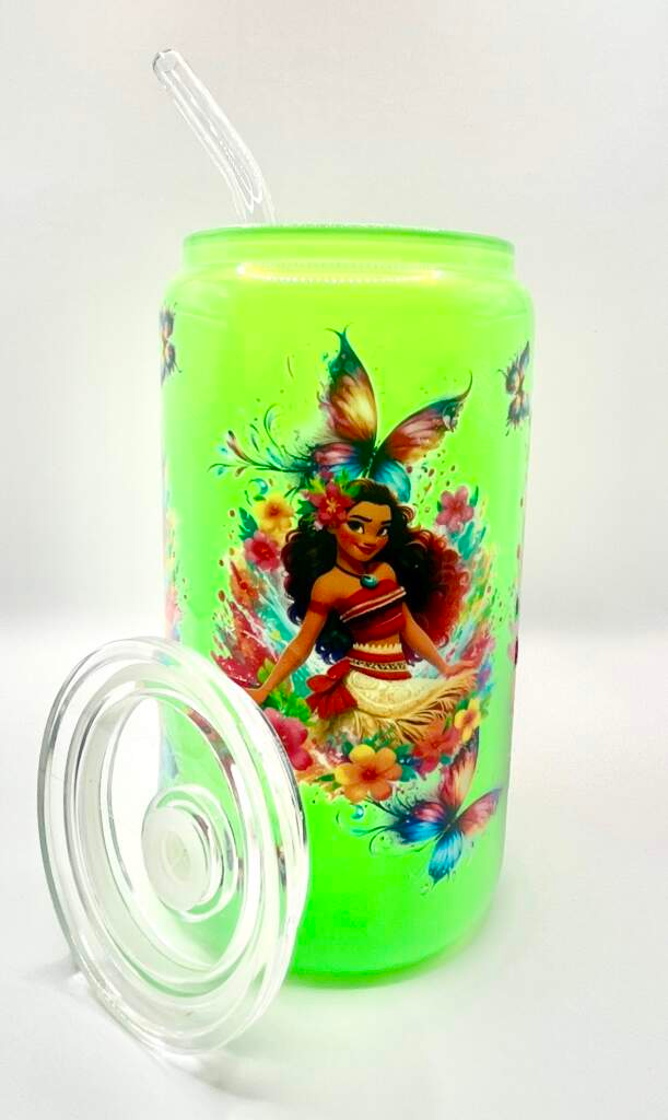 Moana Wrapped 16oz Libby Glass Beer Can Style Cup with Acrylic Lid and Reusable Glass Straw.